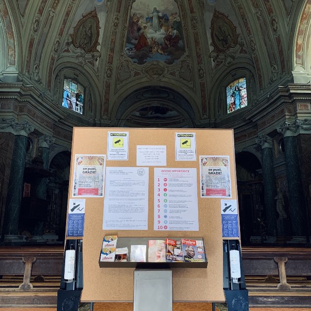 Entrando in chiesa troverete questo totem. Ci sono 2 igienizzatori per le mani, da azionare con il pedale. Le riviste e i sussidi acquistabili (toccare solo ciò che si acquista) sopra la bussola delle offerte. Il protocollo per questa fase2 e il decalogo da osservare…